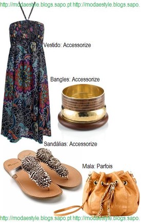 Caso queiras usar um vestido curto, segue a minha sugestão: um vestido escuro florido, umas sandálias muito engraçadas com aplicações em castanho/bronze, uma tote em tons de caramelo e um conjunto de bangles dourado/madeira.