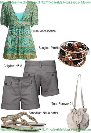 Este look é para aquelas que pretendem usar calções no Sarau. É composto por uma blusa de estilo tribal com vários motivos em tons de verde/azul, uns calções cinzentos claros, umas sandálias entrelaçadas em tons de bege, uma tote em tons de branco sujo e um conjunto de pulseiras em madeira.