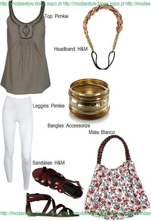 É um óptimo look pois é confortavél e com várias tendências da estação. Um top lindissimo rendado na parte do peito e nas alças em tons de kaki, umas leggins brancas compridas, umas sandálias tipo gladiador em castanho, uma mala XXL florida em branco com a alça em castanho, um conjunto de bangles em madeira/dourado e uma headband em forma de trança em tons de laranja/amarelo.