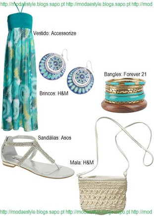 Também poderás usar um vestido comprido, como sugiro neste look. O vestido comprido é em tons de azul e é florido, as sandálias são em prateado com algumas aplicações brilhantes, uma mala em ráfia bege, um conjunto de bangles azuis/douradas e em madeira e uns brincos azuis a condizer com o vestido.