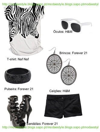Este look é em tons de preto e branco. É bastante sexy. Uns calções em preto, que acentam super bem, uma pulseira também em preto, umas sandálias de tacão gladiador, uns brincos grandes bastante personalizados, uma t-shirt em preto e branco e por fim uns oculos de sol.