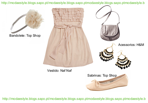 Adoro este look! É bastante feminino, e em tons nude: os tons da tendência! O vestido é super giro, ligeiramente curto, e feminino! Para dar um ar ainda mais feminino ao look, pus umas sabrinas também em nude. Acrescentei uns brincos que achei que ficavam super bem para quebrar os tons claros. A mala é pequena, é bastante fofa. Para completar o look, uma bandolete super gira!