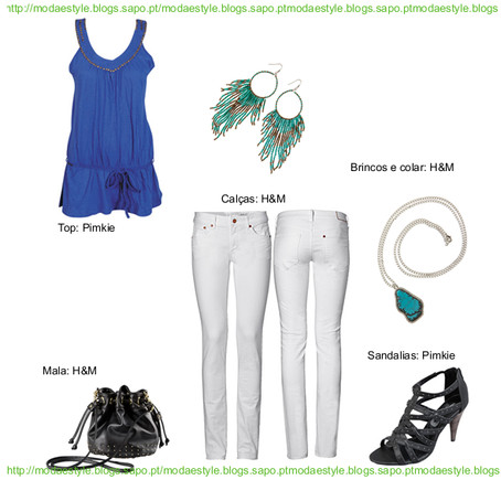 Com skinny jeans em branco, este look tornou-se mais prático. Contrasta com um top em azul-escuro, umas sandálias (que dão um toque feminino) e a mala em preto. Depois, um colar com uma pedra em azul, a combinar com uns brincos em azul.