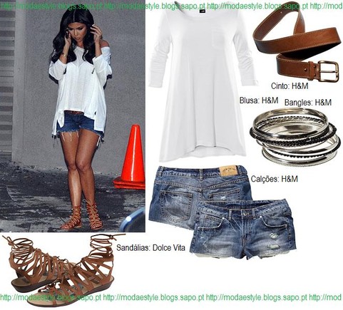 E este é outro look descontraído que a Kourtney usa. É simples e o ideal para as adolescentes, para os dias/noites mais frescas de Verão. É composto por uma blusa em branco básica, uns calções de ganga escura, umas sandálias tipo gladiador em castanho, um conjunto de bangles em prateado e um cinto castanho de espressura média para segurar os calções.