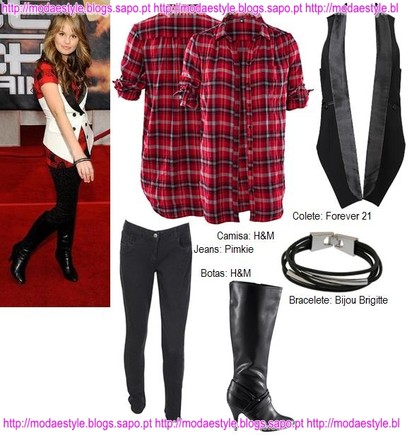 Este look tive mesmo de recriar, pois foi difícil arranjar um colete idêntico ao da Debby. Por isso, decidi usar uma camisa em vermelho com xadrez em preto, umas skinny jeans em preto, umas botas de cano alto em preto, uma bracelete com fios em preto e um colete comprido em preto. Com estas peças, obtemos um look com algumas influências do estilo rock.