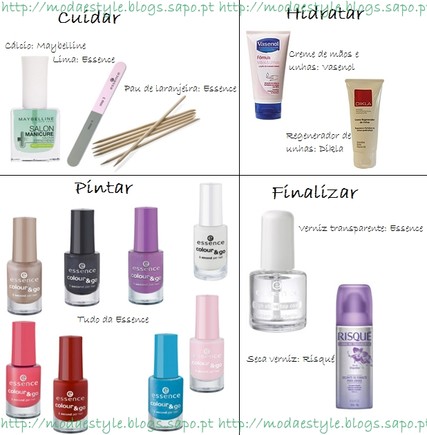Como podem ver, dividi as diferentes etapas que as tuas unhas devem de ter: A fase antes de pintar (Cuidar), a fase de Pintar, Finalizar e a parte de Hidratar, que deve ser diária. Na parte Cuida como já referi, são os cuidados que deves de ter antes de pintar. Deves de tirar as cutículas com a ajuda dum pau de laranjeira. Se for necessário cortar as unhas, faz-lo com a ajuda de um corta unhas e depois, lima-as ao teu gosto (quadradas ou redondas). Por fim, deves de passar uma camada de cálcio para as unhas, para permitir uma melhor adesão do verniz e para as proteger. Na parte de Pintar, sugeri vários vernizes distintos, agora é só escolheres o que mais gostas, mas dou um conselho: se tiveres entre os 10 e os 12 anos, deves de apostar em cores claras como o rosa claro e o branco e só depois começar a experimentar, gradualmente, outro tipo de cores. Para finalizar, deves de passar uma camada de verniz transparente, que permite proteger o verniz e que ele dure mais tempo. Se o verniz custar a secar ou para secar mais rapidamente, aplica o seca verniz. Para hidratar, decidi por um regenerador de unhas em creme e outro para mãos e unhas, ambos disponíveis no Continente.
