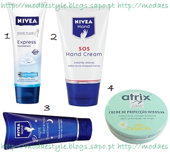 2- Um creme para as mãos secas e gretadas (óptimo para o Inverno) que deixa as mãos macias e suaves. É formulado com Glicerina, Óleos de Cuidado Hidratante, Dexpanthenol e Óleo de Calêndula. Tudo isto, proporciona a regeneração intensiva da pele das mãos secas, tem rápida absorção, efeito suavizante prolongado e alívio imediato das mãos muito secas. (Nivea)