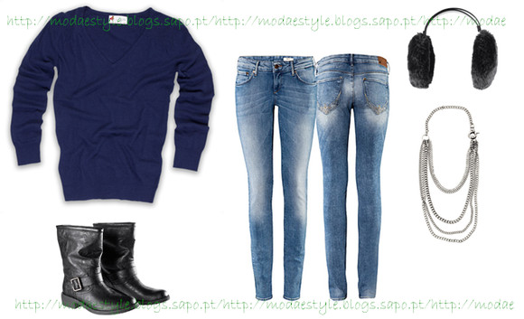 Neste primeiro look, optei por um estilo mais urbano utilizando cores escuras. O pólo azul petróleo, é combinado com umas jeans claras básicas. Para o calçado, escolhi umas botas em preto de inspiração masculina. Para dar um pouco de vida ao look, escolhi umas quentinhas earmuffs em preto, e um colar em prateado. Acho que este look resultou bem: simples, prático moderno e urbano.