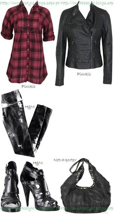 Neste look há uma fusão entre o Estilo Rock e o Estilo Grunge, sendo adequado para as leitoras mais velhas. A camisa/túnica é vermelha ao xadrez preto, um casaco em cabedal preto e umas acid leggins em preto/branco. Para completar o look, umas sandálias tipo gladiador com tacão em preto e uma mala com pormenores em preto. Não adicionei acessórios como podem ver, mas vocês podem optar por umas bangles ou então um colar fino e comprido.