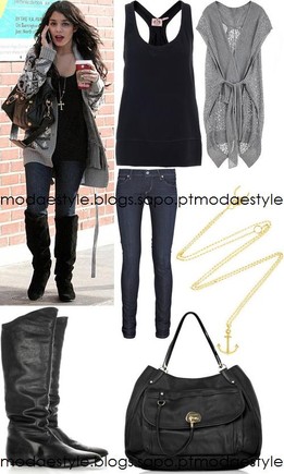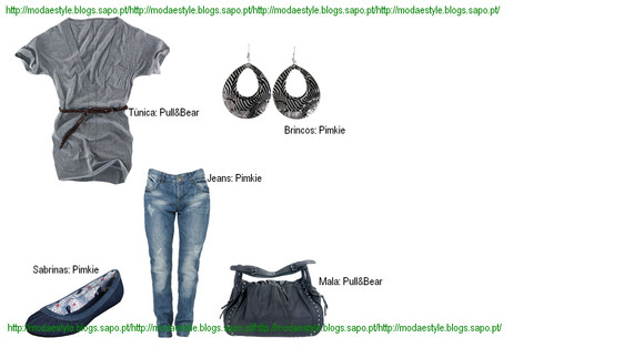 É um look, mais escuro e mais casual. A túnica, em tons de cinzento, fica na perfeição com as jeans boy friend, e a carteira, que dá um certo despertar ao look. As sabrinas, são azuis escuras, que combinam perfeitamente com o look, juntamente com uns brincos, grandes em forma clássica.