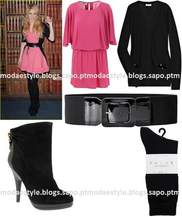 Um vestido cor-de-rosa, um cardigan preto que deverá ser usado aberto, um cinto preto para destacar a cintura, uns botins pretos em camurça e para completar o look umas collants pretas. Para animar o look, aposta nuns brincos ou numas braceletes.