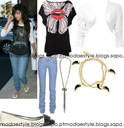 Um optimo look para saídas ao Shopping ou com amigos. Uma t-shirt preta estampada, umas skinny jeans claras, umas sabrinas brancas/pretas, um colar, uma pulseira e um bolero (casaco curto) em branco. Se quiseres optar por juntar uma mala ao look, deverá ser uma mala XXL em preto.