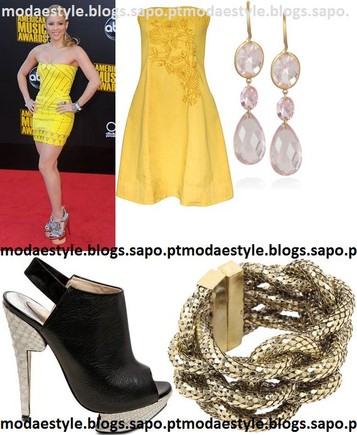 Um vestido cai-cai amarelo com pequenos promenores, uns brincos compridos em ouro, uns sapatos de salto alto em preto e aberto á frente e uma bangle dourada. Podes usar uma clutch preta ou dourada no look.