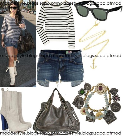 Certamente é um look Boho-Chic, o que é ideal para usar no Verão para saídas com amigos. É composto por uma túnica simples em cinza mas que se quiseres optar por uma como a da Vanessa, ficará muito bem, umas sandálias em cunha em tons de bege, uma mala XXL castanha , uma bracelete em prata com uma pedra e uns oculos escuros com estilo aviador.