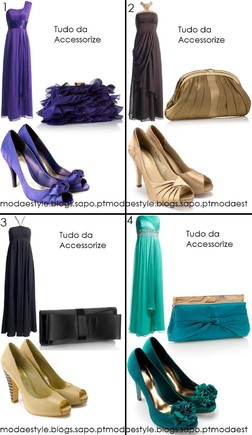4-Um cai-cai em tons de verde-água com alguns promenores em branco, ns sapatos em verde escuro com aplicações em forma de flor e uma clutch azul para contrastar um pouco. Para os acessórios, devem de ser em dourado.