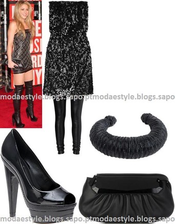Um cai-cai preto com aplicações, umas leggins de cabedal preto, uns sapatos pretos envernizados, uma clutch preta e uma bangle preta. Se quiseres, podes adicionar um cardigan preto ao look, dando um pouco o ar de estilo rock.