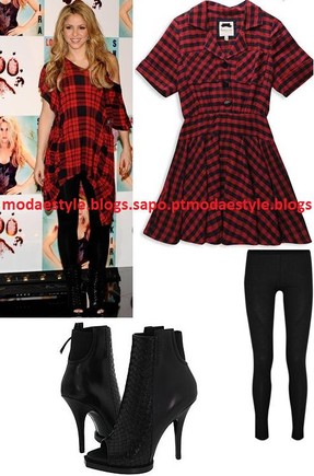 Uma túnica ao xadrez preto e vermelho, umas botas pretas abertas á frente e umas leggins pretas. Como o look é muito "pobre" em acessórios, adiciona um conjunto de bangles ou um colar.
