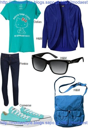 Aqui está um lindissimo look em tons de azul. No fundo "brinquei" um pouco com as várias tonalidades do azul, como podem ver. Para uma ida ao cinema ou usar dia-a-dia, é um look muito engraçado. Uma t-shirt em azul meio esverdeado, umas skinny jeans escuras, umas Converse de versão descida em azul claro, uma mala básica em tons de azul turquesa, uns ocúlos de sol em preto e um cardigan de corte irregular em azul marinho.