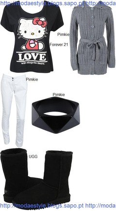 Um look que não deixa de ser prático e simples. Para "cortar" o efeito do preto, decidi juntar umas skinny jeans em branco e um cardigan cinza. Neste look não adicionei nenhuma carteira, mas se tu quiseres, junta uma mala báscia ou XXL em branco. O look é composto por uma t-shirt preta, umas skinny jeans brancas, umas UGG em preto, uma bangle preta e um cardigan comprido e com um laço em tons de cinza.