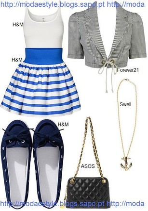 Este look é óptimo para usar no Verão, pois é fresco e tem todas as caracteristicas que o estilo náutico tem. Um top básico branco, uma saia de cinta subida ás riscas horizontais azul/branco, umas sabrinas em azul marinho, uma clutch com corrente em preto, um colar com uma âncora em dourado e um casaco curto ás riscas verticais em branco/preto.