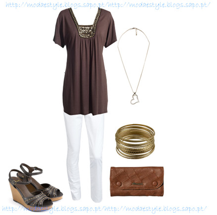 Um look inspirado no estilo braze. Uma túnica em castanho com aplicações na zona do peito da Acessorize, umas jeans brancas da Pimkie, umas pulseiras prateados da Acessorize, uma colar da Forever 21, umas sandálias em cunha em castanho da Acessorize e por fim uma clutch bastante descontraída da Element.