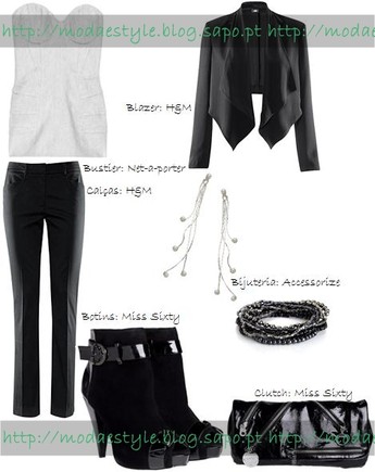Esta é uma forma mais moderna e sofisticada de usar o bustier branco, que é o ponto de cor no look, conjugado com umas calças de corte recto clássicas em preto e um blazer preto de corte irregular, muito bonito. Para acessórios temos uns brincos compridos em prateado, um conjunto de pulseiras em preto/cinzento metálico e uma clutch com fechos em preto. Para calçado, nada melhor do que uns sofisticados botins em preto abertos á frente.