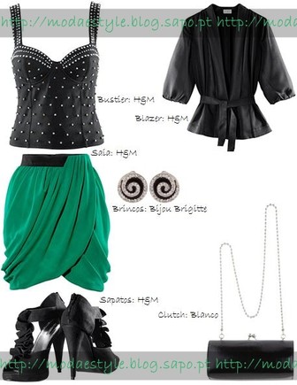 No outro look o ponto de cor era o bustier, neste caso o ponto de cor é a saia com pequenos folhos em verde água, conjugada com um bustier com tachas em preto e um blazer tipo blusa em preto. Para acessórios temos uns brincos curtos em preto com círculos em prateado e uma clutch com corrente em preto. Para o calçado, umas sandálias com pequenos pormenores á frente.