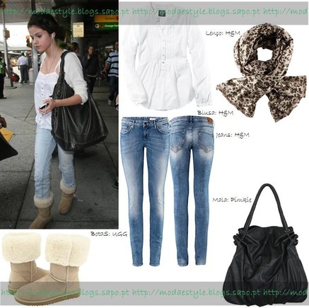 Ela usou um top e um cardigan em branco, que substitui por uma blusa de manga comprida em branco, conjugada com umas skinny jeans em ganga um pouco mais escura do que as jeans que a Selena usou. Umas quentinhas e confortáveis botas UGG de cano baixo com algum pêlo em bege e uma mala XXL em preto. Para o look não ficar "pobre" em acessórios, decidi juntar um lenço com um estampado animalesco em tons de castanho/bege, que compõe o look na perfeição.
