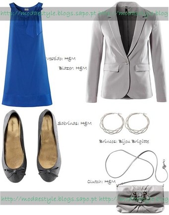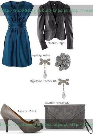 Este look é mais sugerido ás leitoras mais jovens, que não ficam de parte! O vestido é de corte recto com um laço na zona do peito em azul turquesa, umas sabrinas em cinzento, acompanhados de um blazer em tons de branco sujo. Para acessórios temos uma clutch em branco sujo com aplicações e com corrente e umas argolas entrelaçadas em prateado, visto que o vestido não "pede" muitos acessórios.
