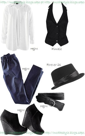 Este look é muito sofisticado. A camisa branca comprida contrasta com as jeggins em ganga escura e com os restantes acessórios em preto. Decidi juntar um colete preto. Para acessórios, nada melhor que uns botins de rampa em preto, um cinto em preto para marcar a cintura e um chapéu em preto.