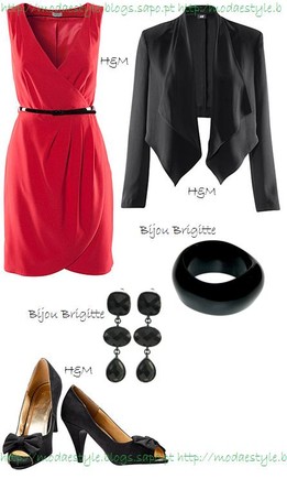Este look é talvez adequado para as leitoras mais velhas e um pouco mais formal. O vestido é vermelho com um cinto incorporado em preto que contrasta com o blazer de corte irregular em preto. Para o calçado optei por uns pep toe em preto com um laço. Para os acessórios escolhi uns brincos compridos em preto e uma bangle em preto. Sugestão: Para o look ficar mais aconchegante podes usar uma camisola de gola alta em branco por debaixo do vestido e podes usar umas collants pretas opacas ou então umas meias de vidro.