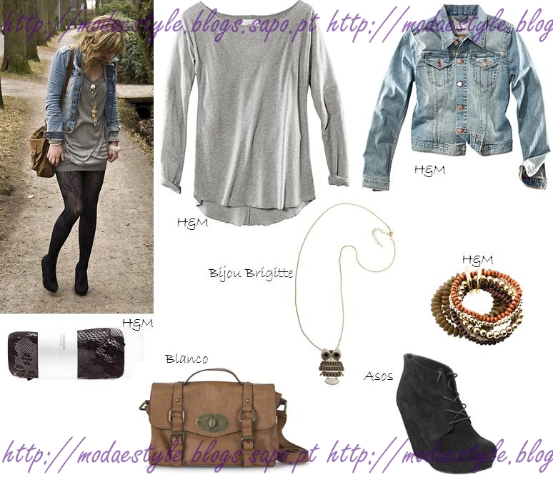 Como os dias têm aquecido, trouxe este look composto por uma túnica em cinzento, básica que neste caso serve de vestido, conjugada com umas collants rendadas em preto. Para agasalhar, nada melhor que um blusão de ganga, que continua em alta esta estação. Para o calçado, Joleena optou por uns botins de cunha com atacadores, que ficam bem no look! Se ainda não tiveres idade para usar tacão ou simplesmente queiras algo mais prático, podes substituir por umas UGG ou outro tipo de calçado raso. Para completar o look, nada melhor que acessórios! Acessórios esses que são: um colar com pendente em forma de mocho em prateado, um conjunto de pulseiras de missangas em várias cores e uma mala menssageiro/school bag em tons de castanho claro.