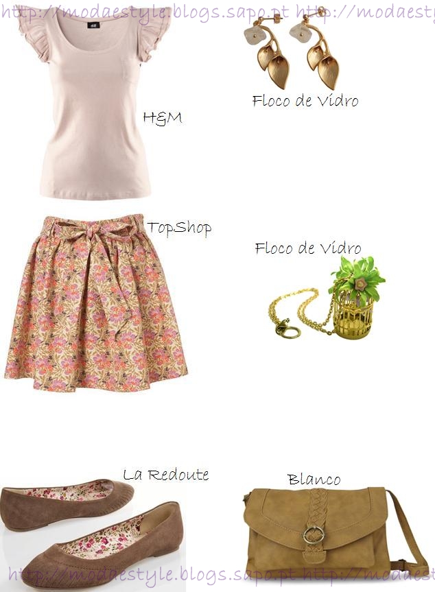 Este é um look óptimo para usar em dias onde o calor predomine. Mais uma vez a t-shirt é em bege básica mas com pormenores nos ombros que conjuga com uma saia florida com um cinto por cima. Mais uma vez, as sabrinas em toupeira para o calçado. Como a saia tem um motivo floral, decidi adicionar uns brincos em forma de flores em dourado e um colar com uma gaiola também em dourado, que dá um ar mais divertido ao look. Para finalizar, uma mala à tiracolo em toupeira.