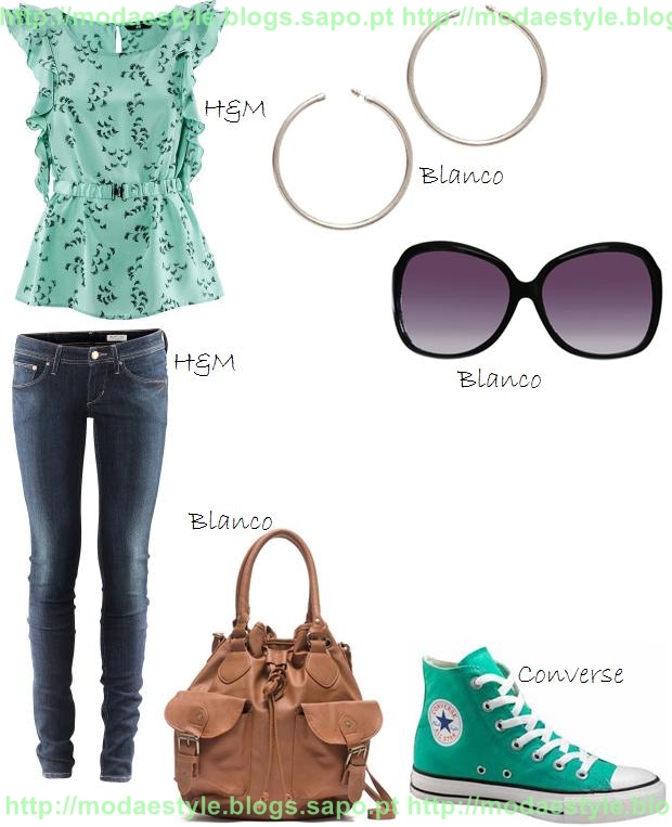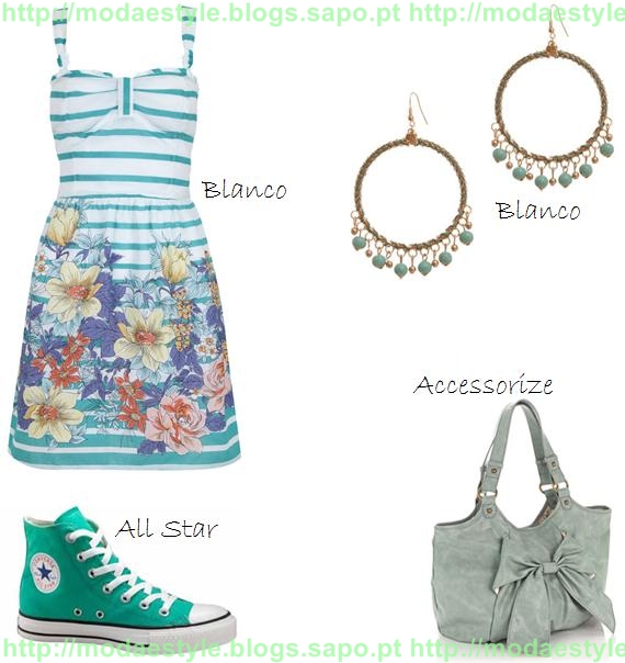 Este look, é para as meninas que gostam de vestidos. O vestido é ás riscas horizontais em tons de azul com florido em baixo. A mala é grande, em tons de verde com um laço, muito engraçada. Para compor o look, escolhi uns brincos em forma de argolas com missangas em verde, porém podes adicionar umas pulseiras ou um anel, consoante o teu gosto.