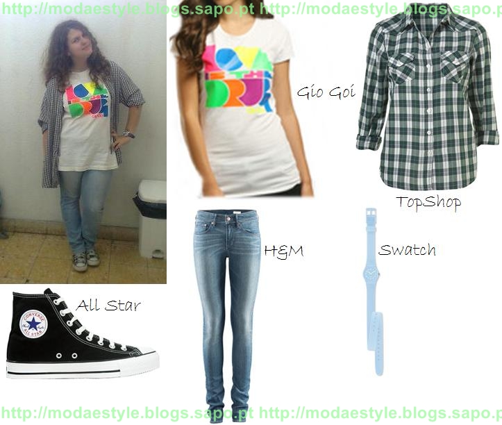 A t-shirt é lindissima, em branco com uma mensagem em cores neon a dizer "Love Is The Drug" que assim à primeira vista parece um desenho geométrico! Depois uma camisa ao xadrez em branco/verde (apesar que a da imagem é mais fina e em tons de azul/branco). Umas skinny jeans em ganga média e umas All Stars em preto a substituir as de xadrez. Como não arranjei nenhum relógio igual, substitui por um azul clarinho da Swatch, que dá para dar 2 voltas.
