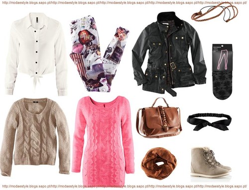 Nesta imagem algumas das peças que me chamarão à atenção, e que gostava realmente de ter. A camisa é linda, em branco e com botões pretos e com um laço feito na cintura. Fica super bem com saias de cintura subida, calções e até mesmo calças. As leggins são diferentes, adoro-as, gostava mesmo de as ter. Como o frio está a vir em força, nada melhor que um camisolão grosso. Adorei este em bege! Coloquei uma túnica bem grossa, de lã, em rosa. Acho que dá mais cor a qualquer look! Nada melhor que um bom casaco. Adorei este em preto que coloquei, faz mesmo o meu estilo. O que eu sempre quis ter foram umas meias rendadas, estas são lindas! A mala é bastante gira, em castanho, adorei-a e é fácil de combinar. A gola tem vários tons de castanhos (não se vê bem na imagem), é mesmo super gira. Para o cabelo, adorei a headband em castanho e a bandolete em preto com um lacinho - super amorosa! Quanto ao calçado, estas botas/sapatilhas chamaram-me à atenção.