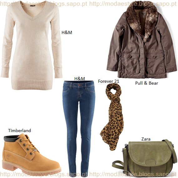 Nesta primeira opção decidi criar um look básico mas composto ao mesmo tempo. Uma camisola de manga comprida em bege que contrasta com umas skinny jeans de lavagem escura. Para agasalhar, um casaco em castanho com pêlo na gola e as Timberland em bege. Para acessórios, escolhi um lenço com padrão leopardo que poderás substituir por outro padrão/liso ou até por um colar e uma mala pequena em caqui.