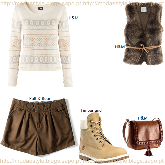 Este look é adequado para dias mais quentes de Outono e para as leitoras que gostam de ousar. A camisola é em branco sujo com um padrão étnico que contrasta com uns calções em castanho. Para agasalhar, decidi escolher um colete em pêlo sintético em castanho com um cinto a marcar a cintura. As Timberland são subidas em bege claro. Para único acessório, escolhi uma mala pequena em castanho, porém, se quiseres, podes adicionar outros acessórios como uns earmuffs ou um colar.