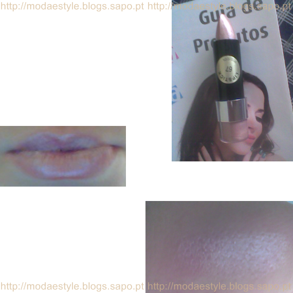 O batom que recebi foi o nº67. É um rosado meio dourado/esbranquiçado, não sei muito bem definir a sua cor. Como podem ver na imagem, é um batom que dá brilho, que na minha opinião, fica engraçado para uma maquilhagem para uma saída à noite ou para algum evento temático (como por exemplo o Halloween, Carnaval, ...)