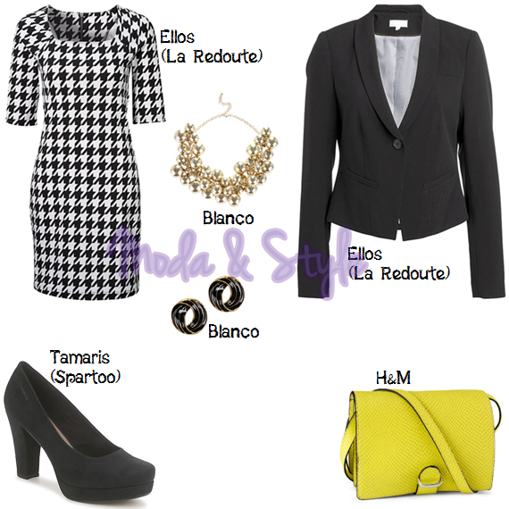 Por fim, se tem um estilo mais retro, que tal apostar num vestido com um padrão alusivo a esse estilo? Combine-o com um blazer preto e uns sapatos também pretos e dê destaque aos acessórios, aposte num maxi colar em dourado e nuns brincos pretos com detalhes em dourado curtos. Para dar um toque mais moderno ao look, decidi escolher uma mala à tiracolo em amarelo, creio que dá um ar mais irreverente e um toquezinho de cor a este look que à partida seria sóbrio.