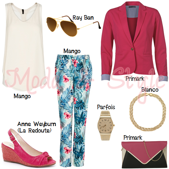 Apesar dos espardilhos conferirem um ar casual e descontraído muito facilmente, podemos também criar um look mais cuidado e actual. Escolhi uns rosados para conjugar com umas calças azuladas com estampado tropical, conjugado com um top fluído em tons de creme e com um blazer em rosa. Para complementar o look e conferir um ar mais moderno, escolhi um maxi colar curto em dourado, um relógio com um toque vintage também em dourado, uns óculos estilo aviador e uma clutch color blocking.