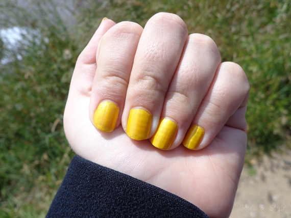 Sim, é um verniz amarelo. Eu disse que a cor era improvável para mim porque eu não gosto nem um bocado de amarelo, ou pelo menos de alguns subtons. Quando vi este menino, parece que aquele ódio de estimação ao amarelo foi-se! Acreditam que agora eu ando mesmo viciada, apaixonada daqui até à lua, de lá até aqui, daqui à lua de novo e de lá até aqui? Mas minhas caras, uma coisa é certa: isto não é paranoia não, é o poder que um verniz tem sob uma mulher! A cor não é maravilhosa? Na minha opinião ela é perfeita agora para os dias solarengos, apesar de já ter tirado esta foto há 5 meses atrás (eu andei feita parola atrás da fotografia milhentas vezes, foi preciso o meu maquinolas - PC - ter que ir para a reparação para a encontrar... Sinceramente!).