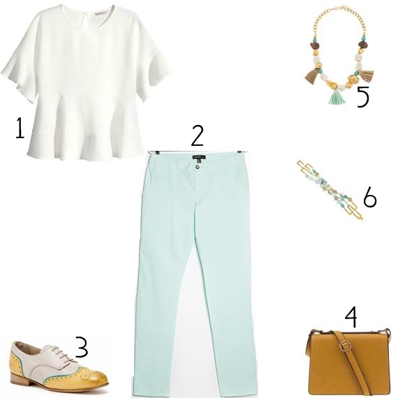 Uma sugestão de look para enfrentar os dias mais friorentos de verão é precisamente esta, que conta com os brogues e com peças bastante coloridas, para dar aquele ar de verão e alegria, tendo apenas um elemento neutro, que neste caso é o top peplum em branco.