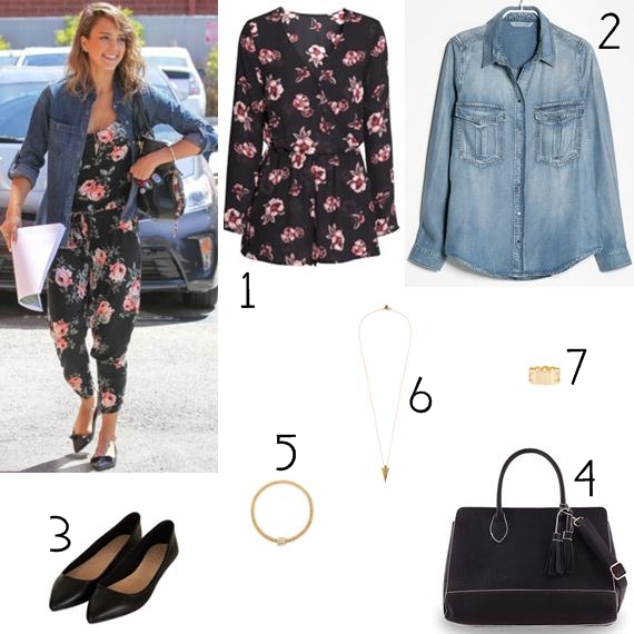 Para vos inspirar para os dias mais quentes, decidi trazer-vos uma sugestão da famosíssima Jessica Alba, que aliás, dispensa qualquer apresentação aqui no blog. A atriz optou por um jumpsuit florido, combinado com uma camisa de ganga e uns sapatos rasos, uma excelente opção para um dia de trabalho. Os acessórios são q.b, e, como não podia deixar de ser, uma mala preta básica. Como vê, é bastante simples e prático de se recriar, como lhe sugiro: