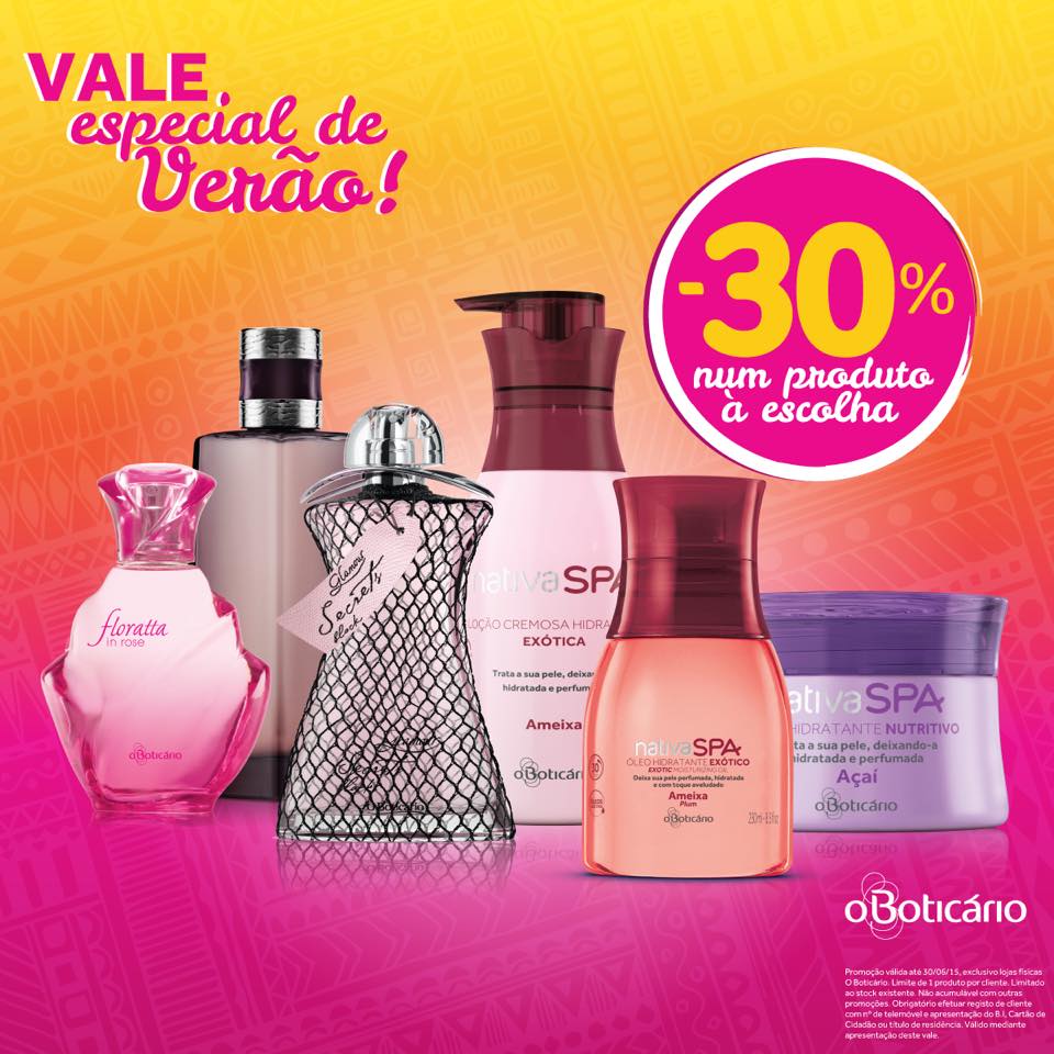 Termine o mês de Junho em beleza, usufruindo deste vale especial verão num 1 produto à sua escolha na loja O Boticário mais perto de si. Válido de 27 a 30 de junho/ não acumulável com outras promoções /1 produto por cliente mediante a apresentação de BI / limitado ao stock existente.