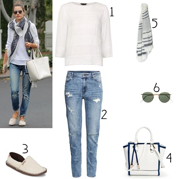 Para enfrentar a situação supraindicada, nada melhor do que tirar do armário aquelas peças que guardamos para situações de emergência como esta. Quem nos dá a inspiração desta semana é Alessandra Ambrosio, que decidiu combinar umas girlfriend jeans com uma camisola branca de manga comprida. Como calçado, umas alpargatas em branco são a melhor opção, dado que são confortáveis e versáteis. Por fim, poucos acessórios mas bons: uma ércharpe estampada, uma mala branca (que decidi trocar por uma no mesmo tom mas com pormenores em azul) e óculos de sol. Et voilá, pronta a passear!