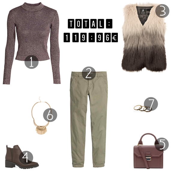 Neste look low cost sugiro um coordenado com algumas das tendências da estação, cujos tons predominantes são os castanhos e os caqui. O foco está, sem sombra de dúvida, para o colete de pelo sintético tricolor - duas grandes tendências numa só peça - que conjuga na perfeição com uns chinos caqui e com a camisola de gola subida em castanho. Depois, alguns acessórios e uns chelsea boots para complementar na perfeição esta combinação. No caso de estarem temperaturas mais frias, sugiro que a este look junte um bom casaco. Verá que estará pronta e por muito pouco. Se não acredita, faça as contas: