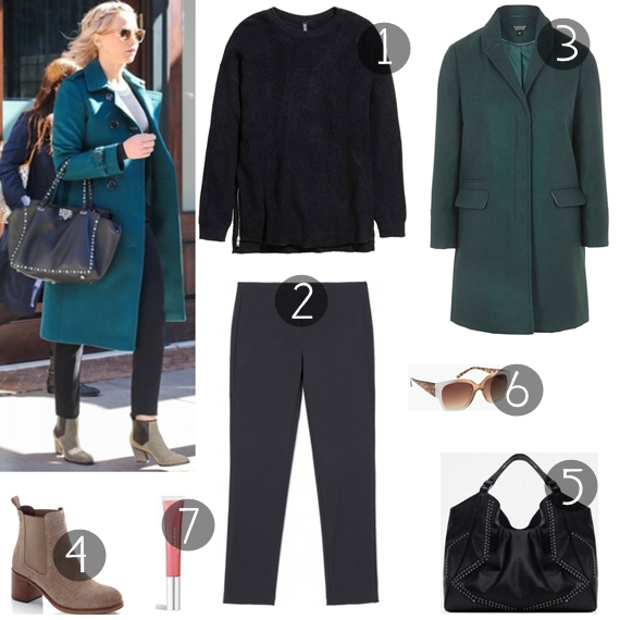 A musa de hoje é a Jennifer Lawrence, que foi recentemente considerada a atriz mais sexy e valiosa do planeta. Com tal distinção, há que fazer jus ao título e ostentá-lo por muito tempo. Nesse sentido, trouxe um coordenado casual mas elegante, ideal para arrancar a semana. Tudo o que precisa são de alguns básicos - uma camisola preta e umas calças de fato em preto - para juntar a um casaco colorido e a uns botins tipo chelsea em bege. De seguida, uns óculos de sol para proteger a visão e uma mala com tachas e et voilá, habemus look.