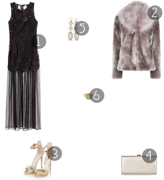 Numa primeira sugestão mais jovem e com influências do estilo rock, decidi conjugar o bustier espelhado com umas calças slim em pele sintética preta (uma forte tendência da estação), umas sandálias de tiras em preto e um casaco de pelo sintético cinzento (outra grande tendência). Quanto a acessórios, uma vez que o bustier já é muito vistoso, decidi ficar-me pelas argolas em metal, por uma bracelete e uma clutch metalizada.