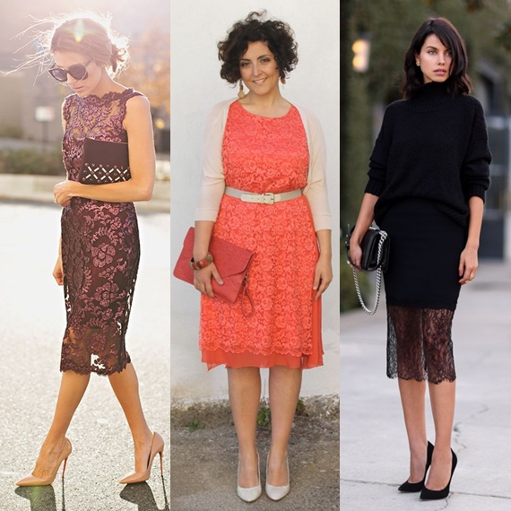 As rendas estão muito presentes nas roupas de festa na passagem de ano. Desde saias a tops, passando ainda pelos vestidos, este tipo de detalhe podem ser usados na íntegra ou misturados com outras tendências. Por exemplo, para um visual mais rock, conjugue uma peça rendada com outra em pele sintética; para um coordenado mais romântico, experimente conjugar a renda com o pelo sintético.